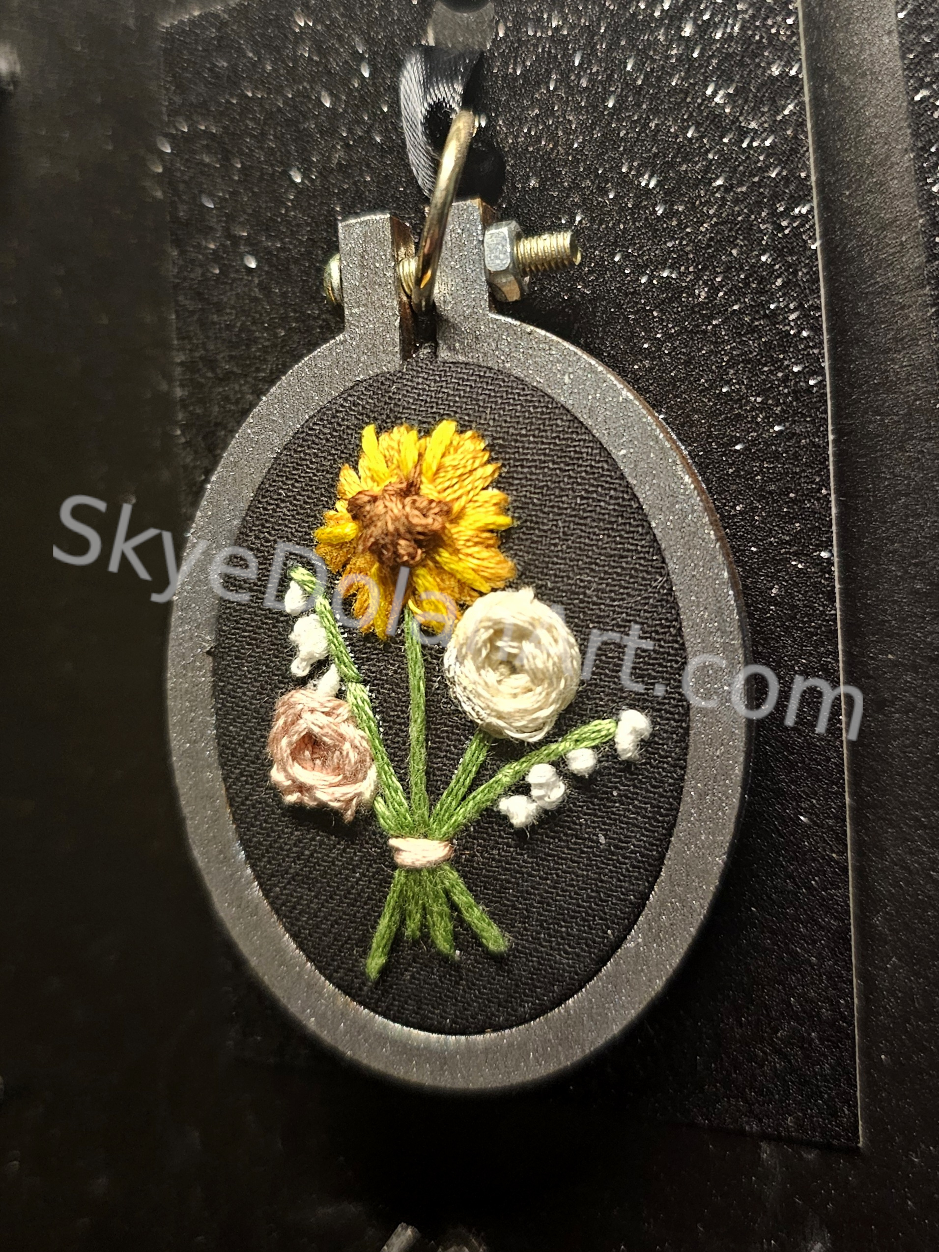 A small handmade pendant featuring a stitched embroidery design on fabric. The embroidery is carefully sewn by hand, creating a textured miniature artwork that can be worn as jewelry or displayed as a small decorative piece. The stitched fabric is mounted in a pendant setting, giving it a finished and durable form. Each pendant is unique because the design is individually embroidered rather than machine-produced. The piece measures approximately 2 inches long by 1.5 inches wide, making it a compact statement accessory. The pendant is sold without a necklace chain, allowing the buyer to pair it with their own preferred cord or chain.”"